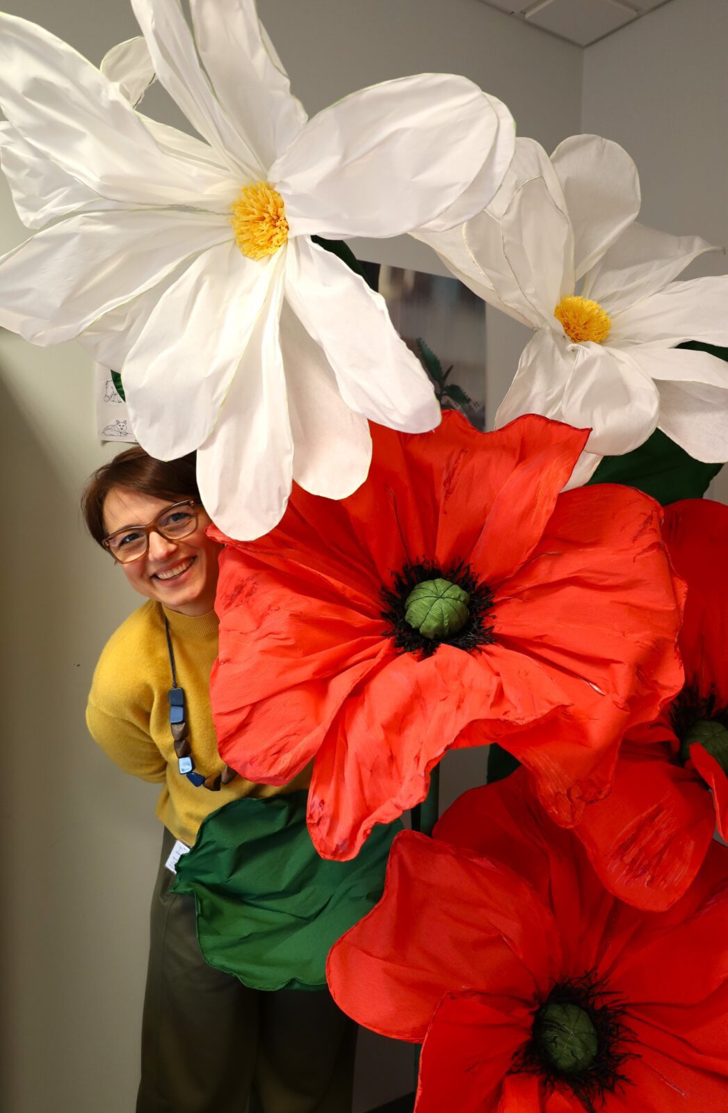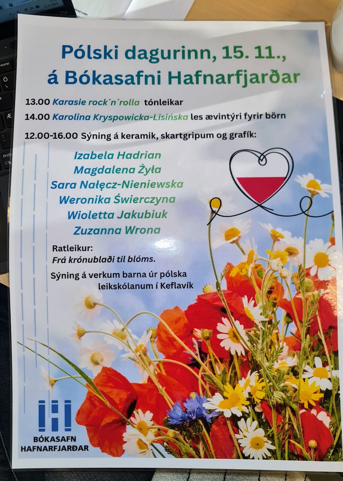 Pólski dagurinn á Bókasafni Hafnarfjarðar Pólsk rokktónlist, grafík, upplestur og keramík fá sitt pláss á Bókasafni Hafnarfjarðar á laugardaginn. Pólski dagurinn verður haldinn 15. nóvember í ár frá kl. 12-16. Þúsund manns komu í fyrra. Sylwia Zajkowska, stjórnandi pólska starfsins á bókasafninu, segir ómögulegt að segja til um hversu mörg koma í ár. „Við höfum meðal annars hengt upp plaköt í pólskum verslunum á höfuðborgarsvæðinu og sett inn á íbúasíður. Ég vona að sem flest komi,“ segir hún. Dagskrá 13.00 – Karasie rock ‘n’ roll tónleikar 14.00 Karolina Kryspowicka-Lisińska les ævintýri fyrir börn 12.00-16.00 Sýning á keramik, skartgripum og grafík Izabela Hadrian Magdalena Żyła Sara Nełęcz-Nieniewska Weronika Świerczyna Wioletta Jakubiuk Zuzanna Wrona Dagskráin þétt og þemað í ár er pólsk blóm og sambærilega íslensk blóm, en var hin ýmsu dýr í fyrra. „Já, við erum með falleg blóm í Póllandi, sum svipuð og hér, önnur ekki,“ segir Sylwia og að þemað brjóti ísinn, gefi færi á samtalinu og kveiki áhuga. „Kannski geta Íslendingar kynnst okkur betur þegar við höldum Pólska daginn.“ Hún hefur búið til ratleik sem börn og fjölskyldur geta tekið þátt í, bæði á pólsku og íslensku á bókasafninu. Pólski dagurinn hefur náð langt út fyrir Hafnarfjörð. Fólk kemur alls staðar að af landinu. „Mér finnst mikilvægt að við getum verið saman. Við getum talað pólsku saman. Ég skrifaði bók í háskóla svo Íslendingar geti lært pólsku. Mér finnst gaman að heyra Íslendinga tala pólsku,“ segir hún. Dagurinn sé sniðinn að því að hitta sitt fólk og tala pólsku. „Það er mikilvægt að við getum verið saman. Stundum er erfitt að búa erlendis, en þegar við sjáum fyrirmyndir í öðrum og kynnumst því hvað fólk er að gera, þá gefur það mikið. Á Pólska deginum getum við sýnt starfið okkar. Við vinnum ekki bara hér á Íslandi. Við lifum fjölbreyttu lífi her á landi og eigum áhugamál,“ segir Sylwia sem er ekki aðeins bókavöður á Bókasafni Hafnarfjarðar heldur einnig leikkona. „Hér á Íslandi má skapa sér fjölbreytt líf. Ef þú til dæmis málar, þá er mögulegt að sýna vekið hér á landi. Þú þarft ekki að vera í Póllandi,“ segir hún. Sjálf gerði Sylwia listaverk fyrir daginn. Risablóm úr kreppappír sem hún stendur hjá á myndinni. „Já, það tók sinn tíma. En þetta er eitt af því sem ég elska að gera.“ 15. nóvember kl. 12:00 til 16:00 á Bókasafni Hafnarfjarðar! Þæfingarsmiðja og pólsk mynstur í Hafnarborg kl. 13-15 Pólski dagurinn teygir sig í Hafnarborg á laugardag. Milli kl. 13-15 býður Hafnarborg pólskumælandi fjölskyldum að taka þátt í þæfingarsmiðju, undir leiðsögn listakonunnar Agötu Mickiewicz, þar sem þátttakendur munu búa til lítil veggteppi úr ull, innblásin af pólskum þjóðlegum mynstrum. Tungumál smiðjunnar eru pólska, íslenska og enska. Kynnumst saman hinni heillandi kúnst að þæfa! Í smiðjunni munu þátttakendur fá að spreyta sig á hefðbundinni aðferð við votþæfingu – þar sem notað er heitt vatn, sápa og núningur til að flétta saman og þétta ullarþræði í mjúkt og litríkt efni. Hvert barn fær tækifæri til að hanna og skapa sitt eigið veggteppi, innblásið af pólskri þjóðlist og menningu. Á mínu máli er viðburðaröð sem miðar að því að auka aðgengi fólks með margs konar bakgrunn að Hafnarborg með því að bjóða gesti velkomna á ólíkum tungumálum. Verkefnið er styrkt af Safnasjóði. Smiðjan fer fram á jarðhæð Hafnarborgar og er opin öllum aldurshópum. Engrar fyrri kunnáttu í listsköpun er krafist, en börn skulu vera í fylgd með foreldri eða forráðamanni. Eins og alltaf er þátttaka í smiðjum sem og aðgangur að sýningum Hafnarborgar gestum að kostnaðarlausu.