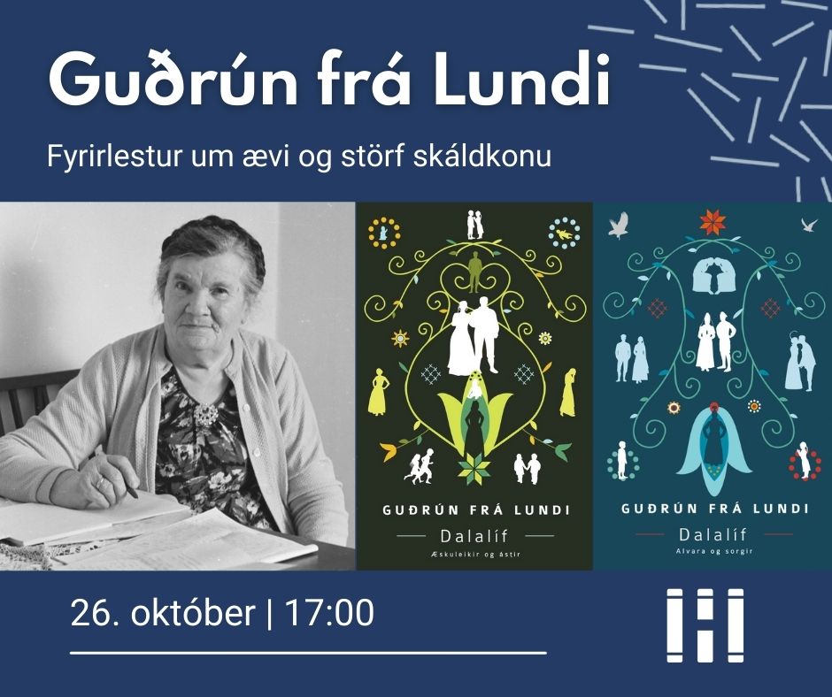 Marín Guðrún Hrafnsdóttir, bókmenntafræðingur og langömmubarn Guðrúnar, heldur fyrirlestur um skáldkonuna Guðrúnu frá Lundi. Rithöfundarferill Guðrúnar frá Lundi er sannkallað ævintýri í íslenskri bókmenntasögu. Óþekkt kona norðan úr Skagafirði verður metsöluhöfundur nánast á einni nóttu og bækurnar tróna á toppi vinsældarlista í rúma tvo áratugi. Guðrún var 59 ára þegar fyrsta skáldsagan kemur út, og eftir það skrifar hún 11 skáldverk gefin út í 27 bókum, þrátt fyrir fjölda hindrana, – en alþýðukonan þráði að skrifa. Guðrún var dáð af stórum hluta þjóðarinnar en raddsterkir áhrifamenn flokkuðu verk hennar með erlendum afþreyingarbókmenntum og reyfararusli. Saga Guðrúnar birtir því bæði ævintýralegar og endurteknar vinsældir en einnig þann þunga undirtón háðs sem einkenndi um tíma alla umræðu um verk hennar. Og auðvitað verður kaffi í boði…